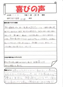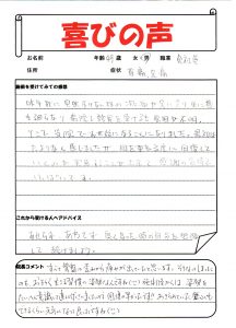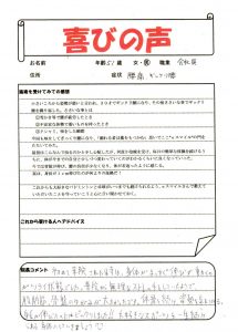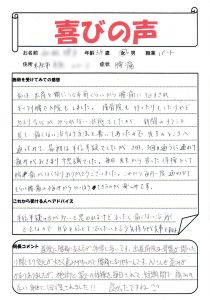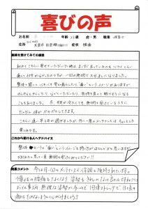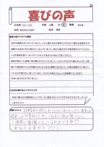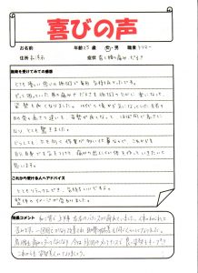 初回の施術で痛みが軽減し、とても喜ばれのを覚えています。^^骨盤の歪みが、大きく、体のバランスが崩れていました。今は月1回のメンテナンスで健康維持されています。良かったですね^^